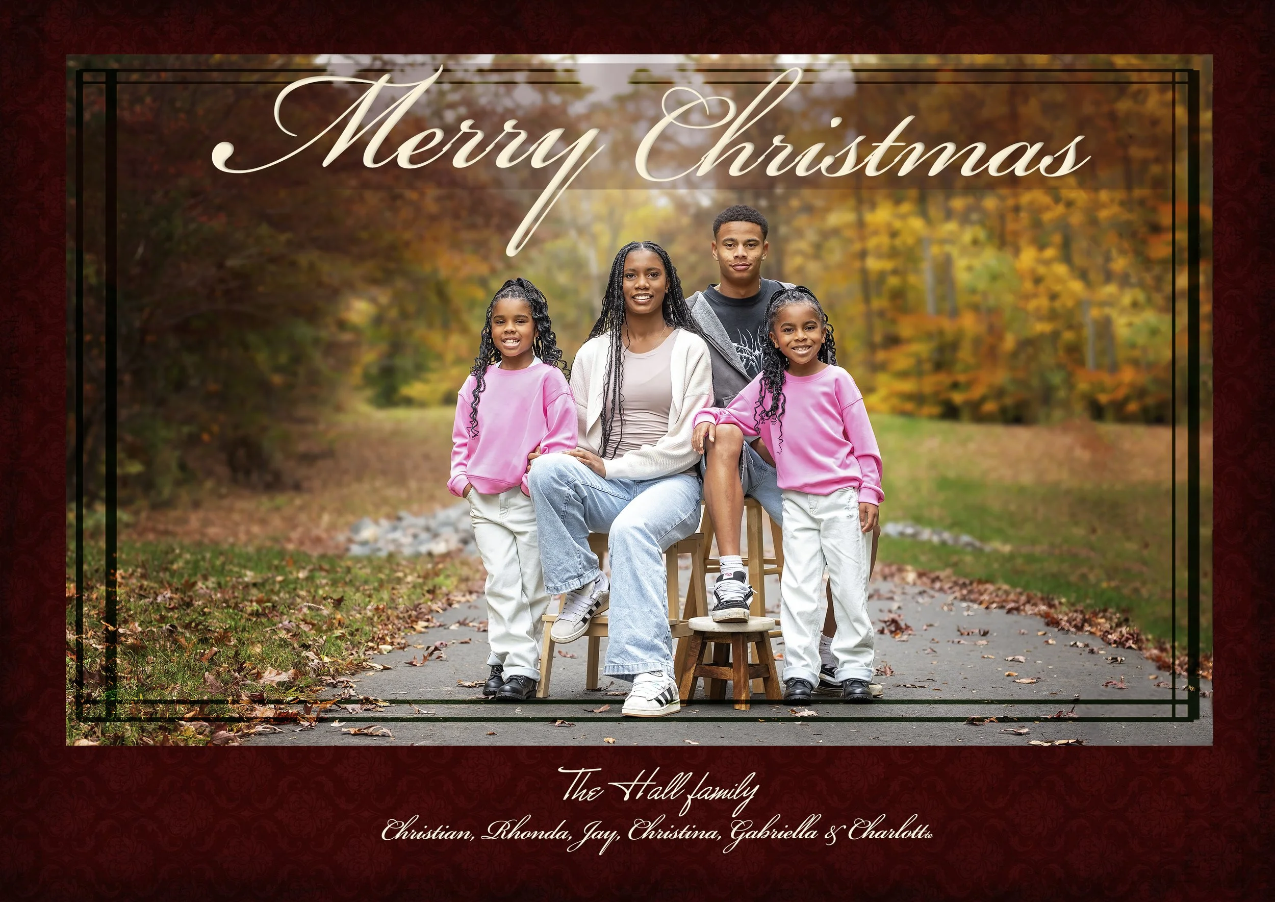 We kept the Christmas card theme fresh this year with a more casual vibe and earth tones in the background to set off the bright pink the girls chose. I did a custom design with a burgundy background to bring a crossover of tones from the trees to the sweatshirts and mom loved it! Each of these kids has grown and changed so much, but the magic of photographing them together like this every year has created a visual time capsule, capturing not just what they look like, but who they are becoming. I adore this family, and getting to create their Christmas card images each season is truly a highlight of my year.